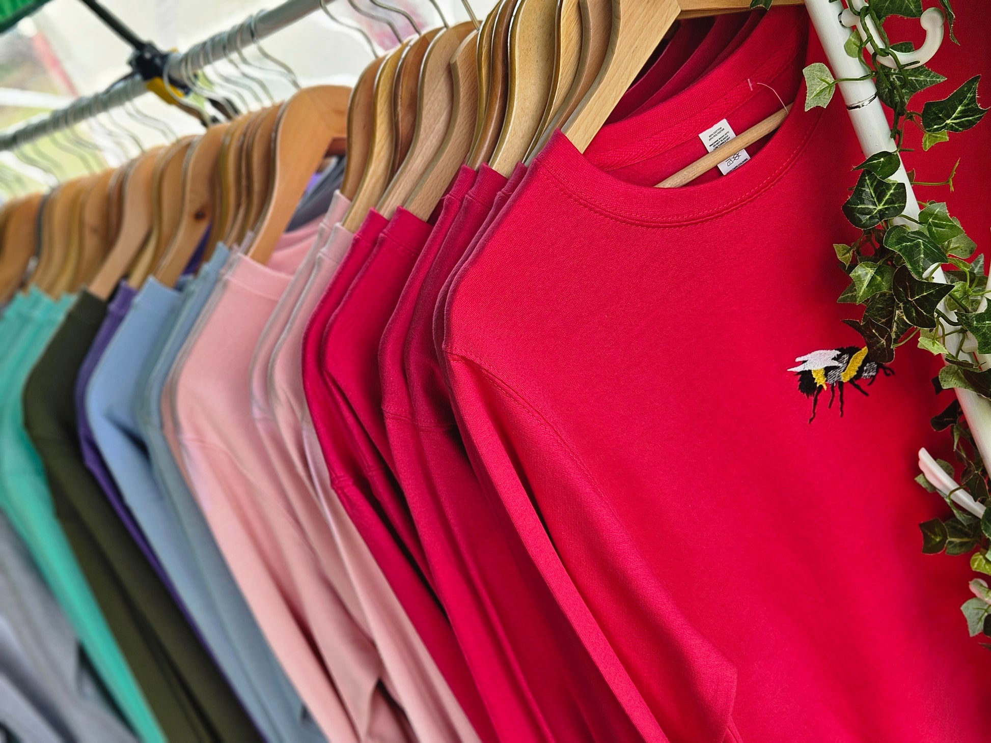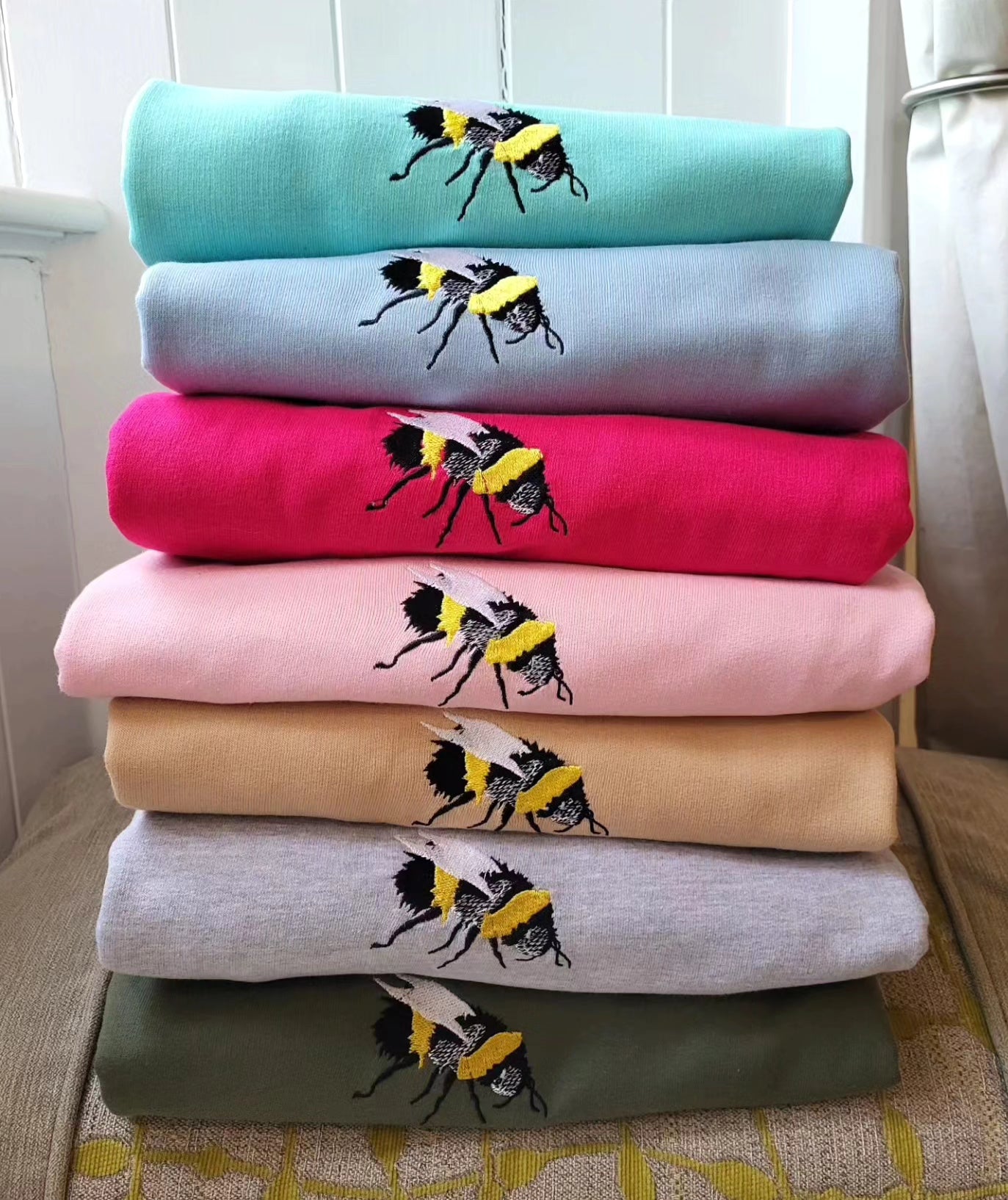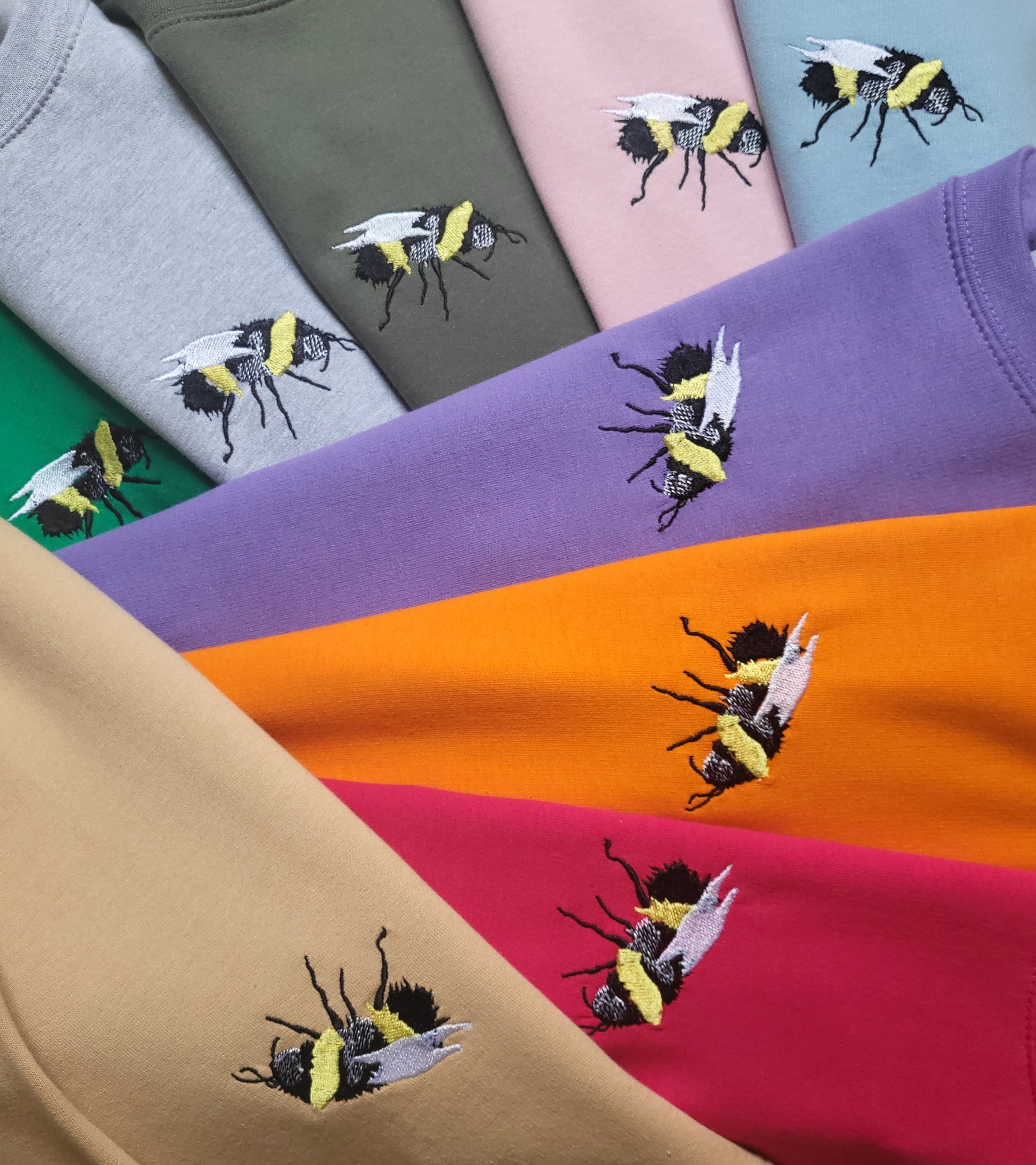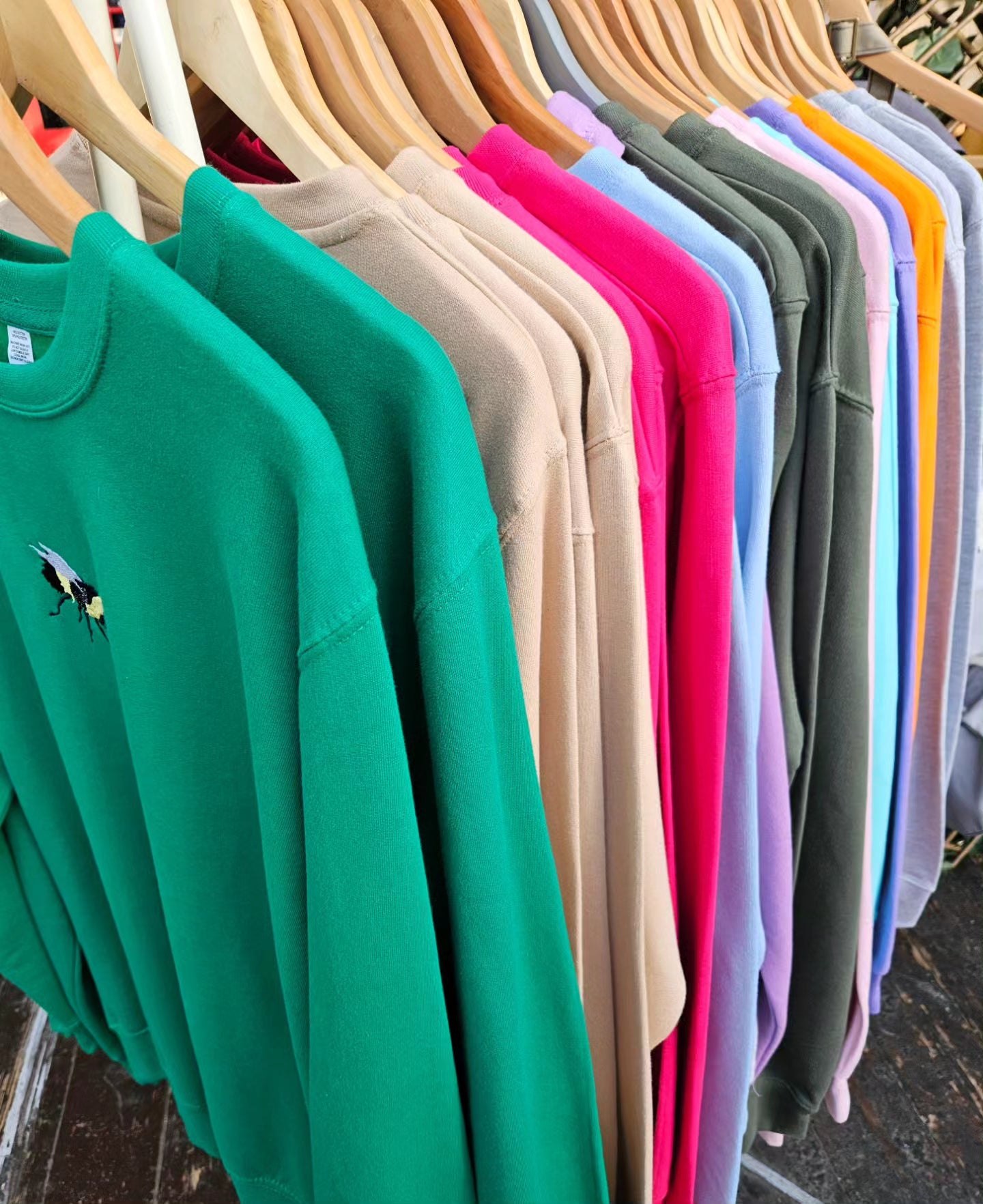 Each sweatshirt is embroidered here in my studio. The design is my own and is also available on other accessories