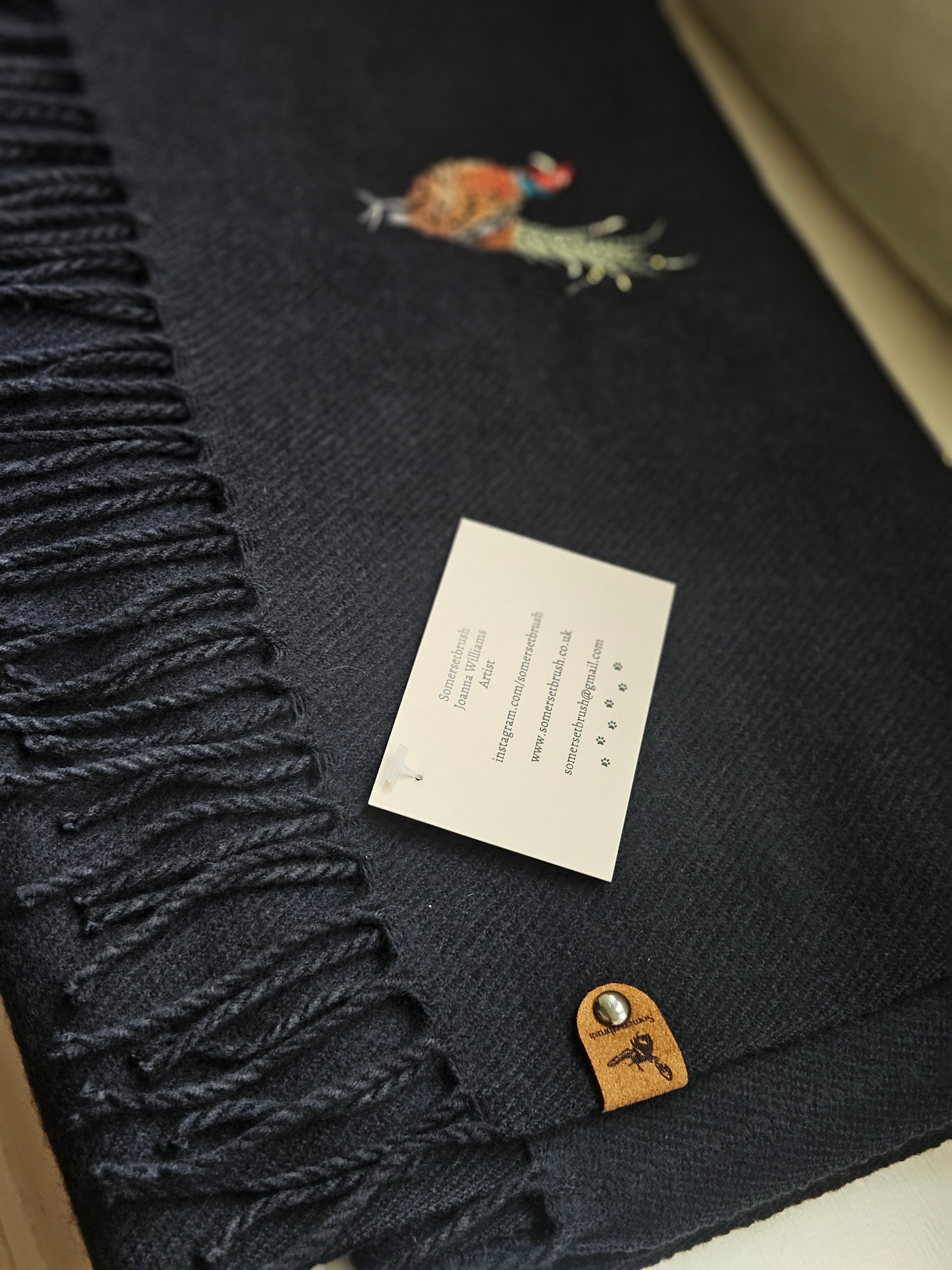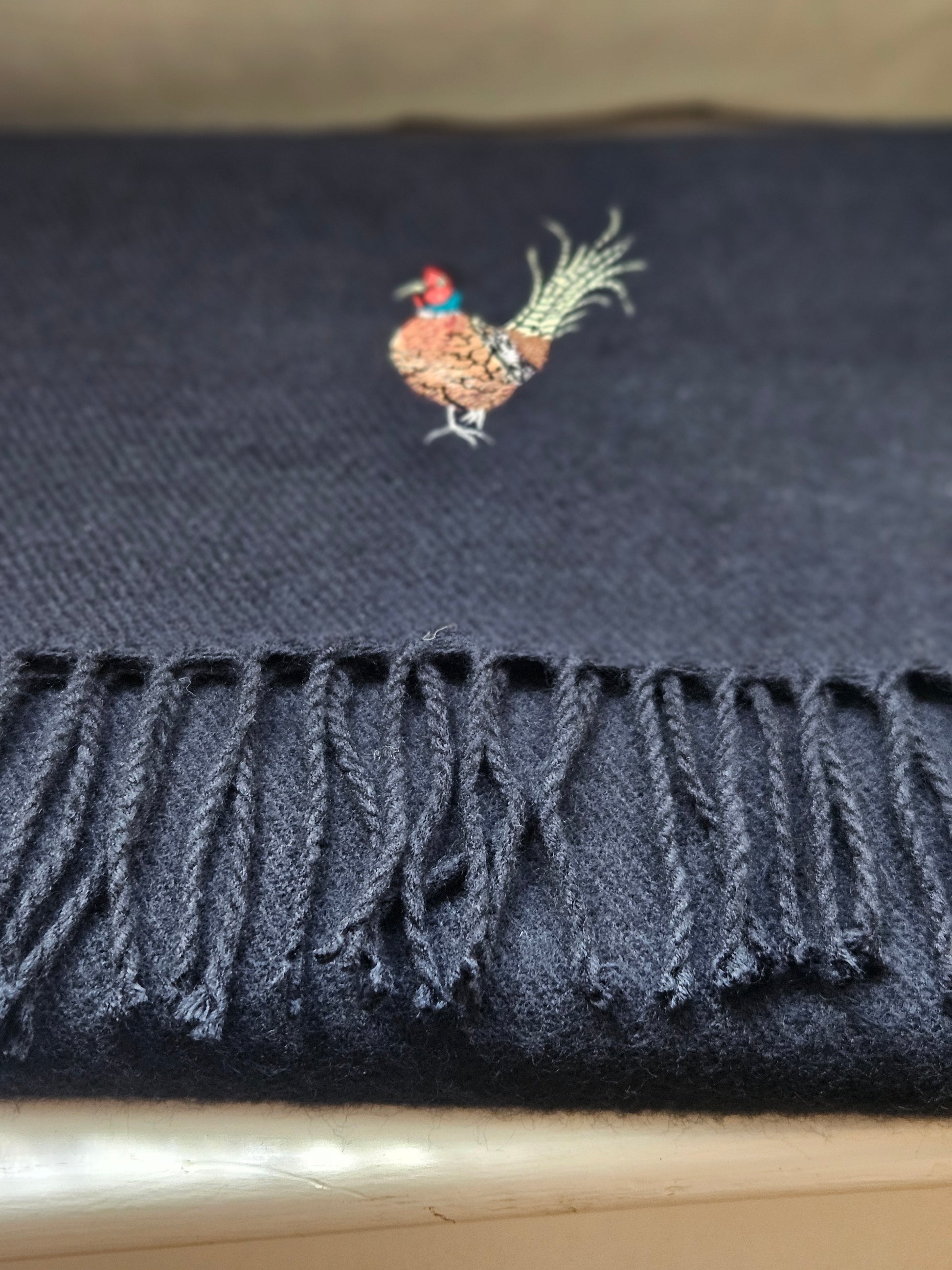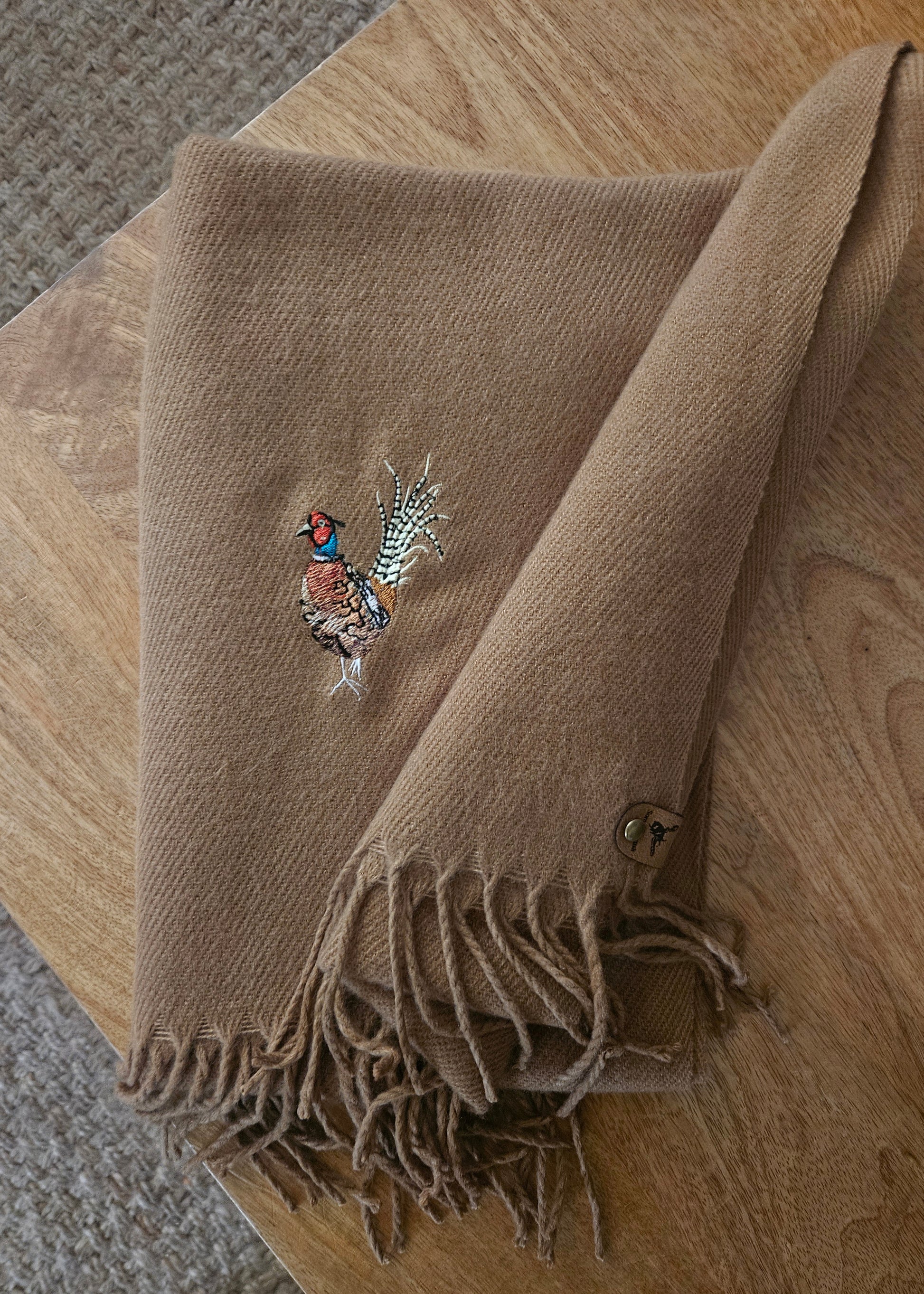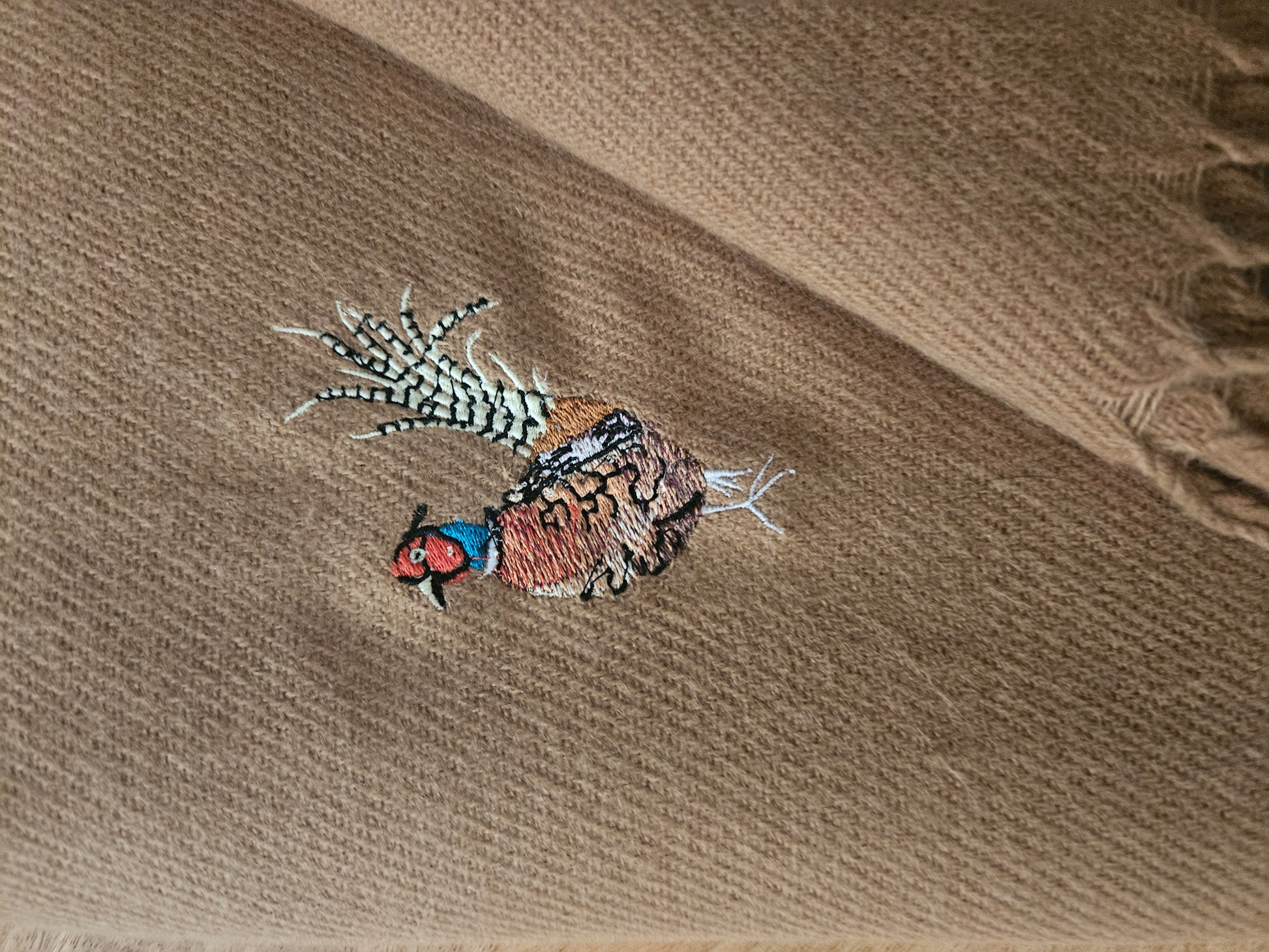 These are so soft. Embroidered with a Pheasant on each end.