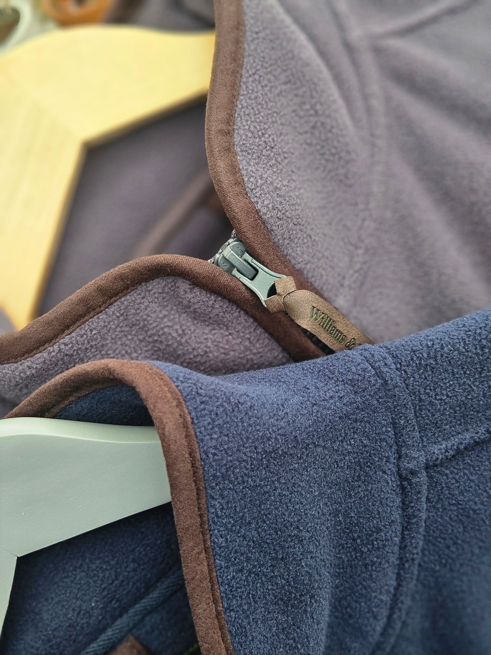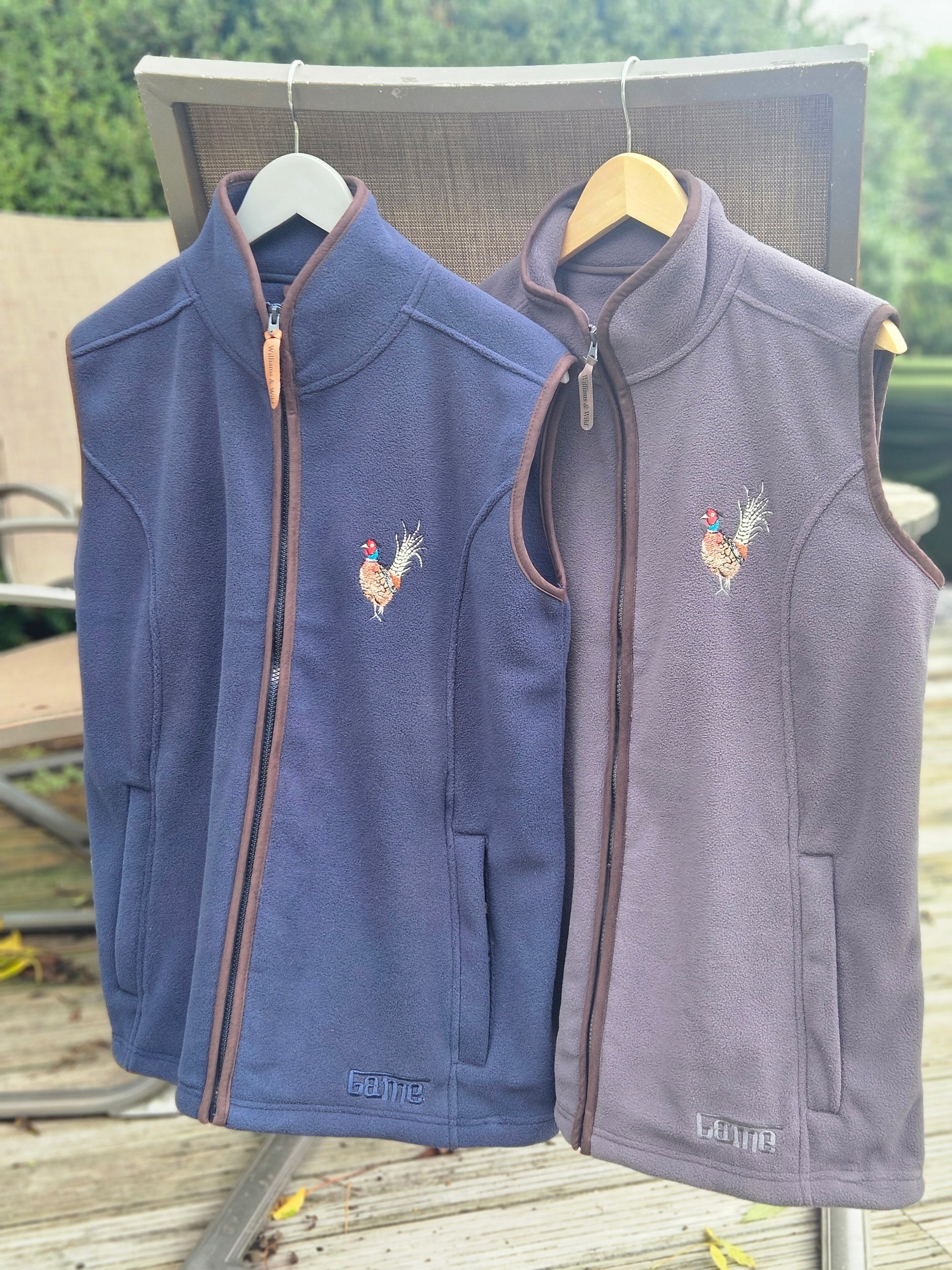 These countryside gilets are very soft, with piping trim details with zip-up pockets on the front.