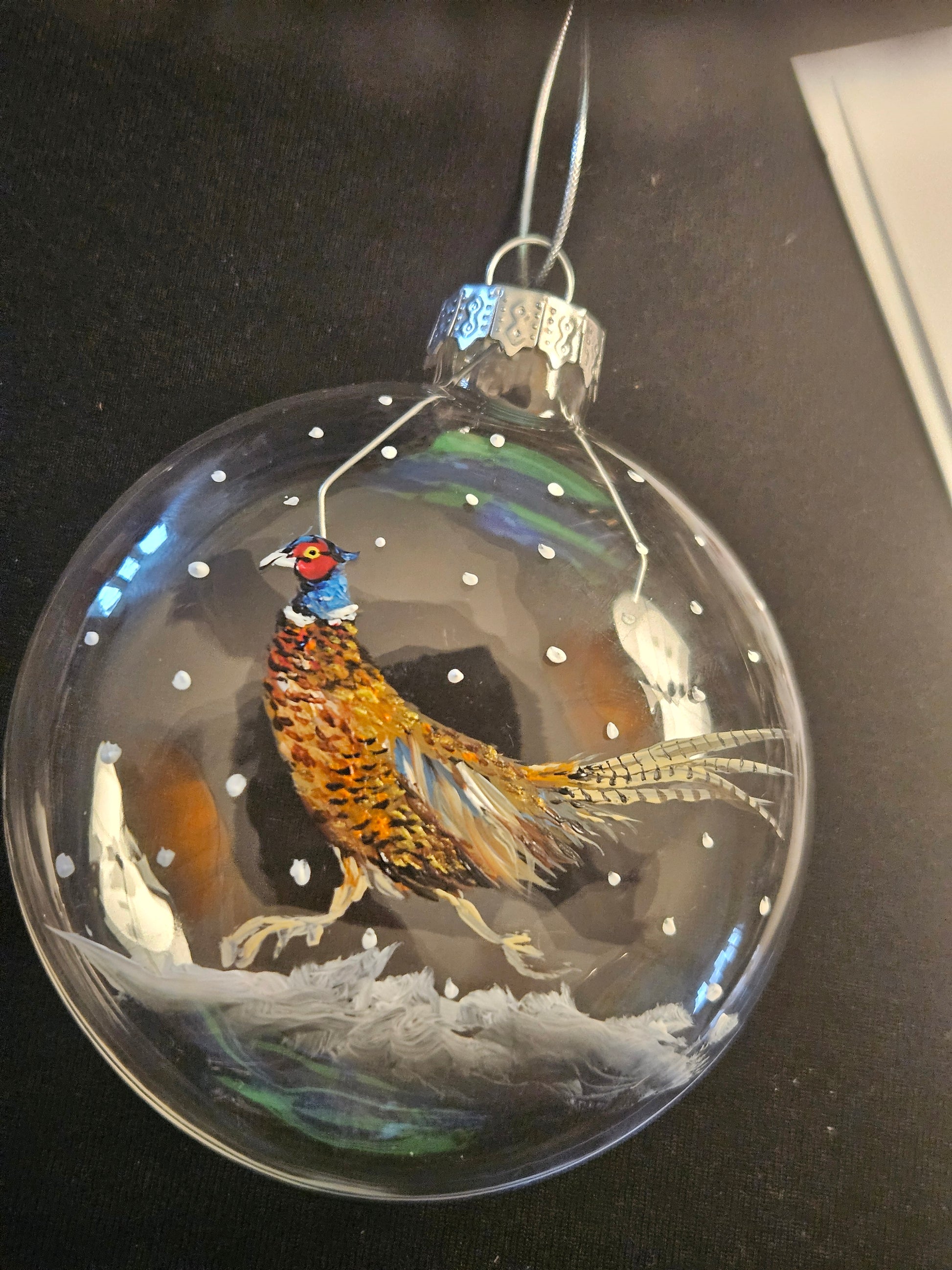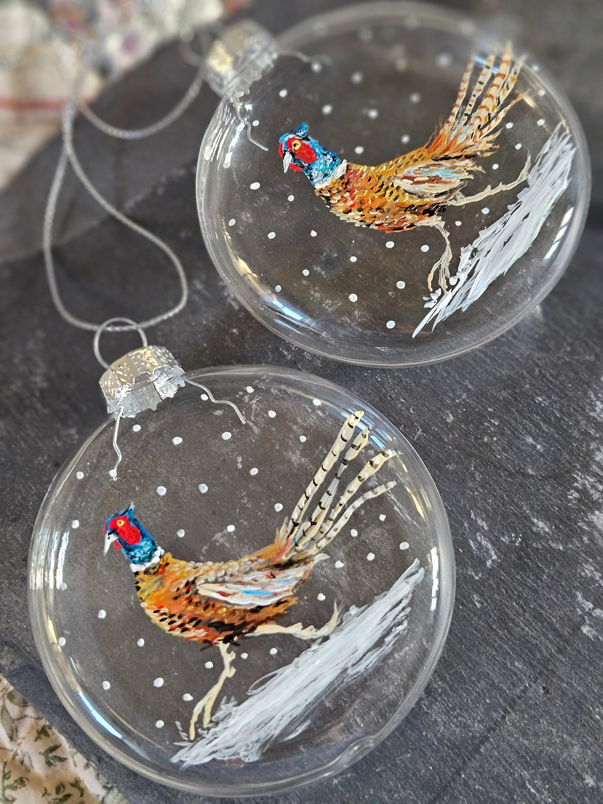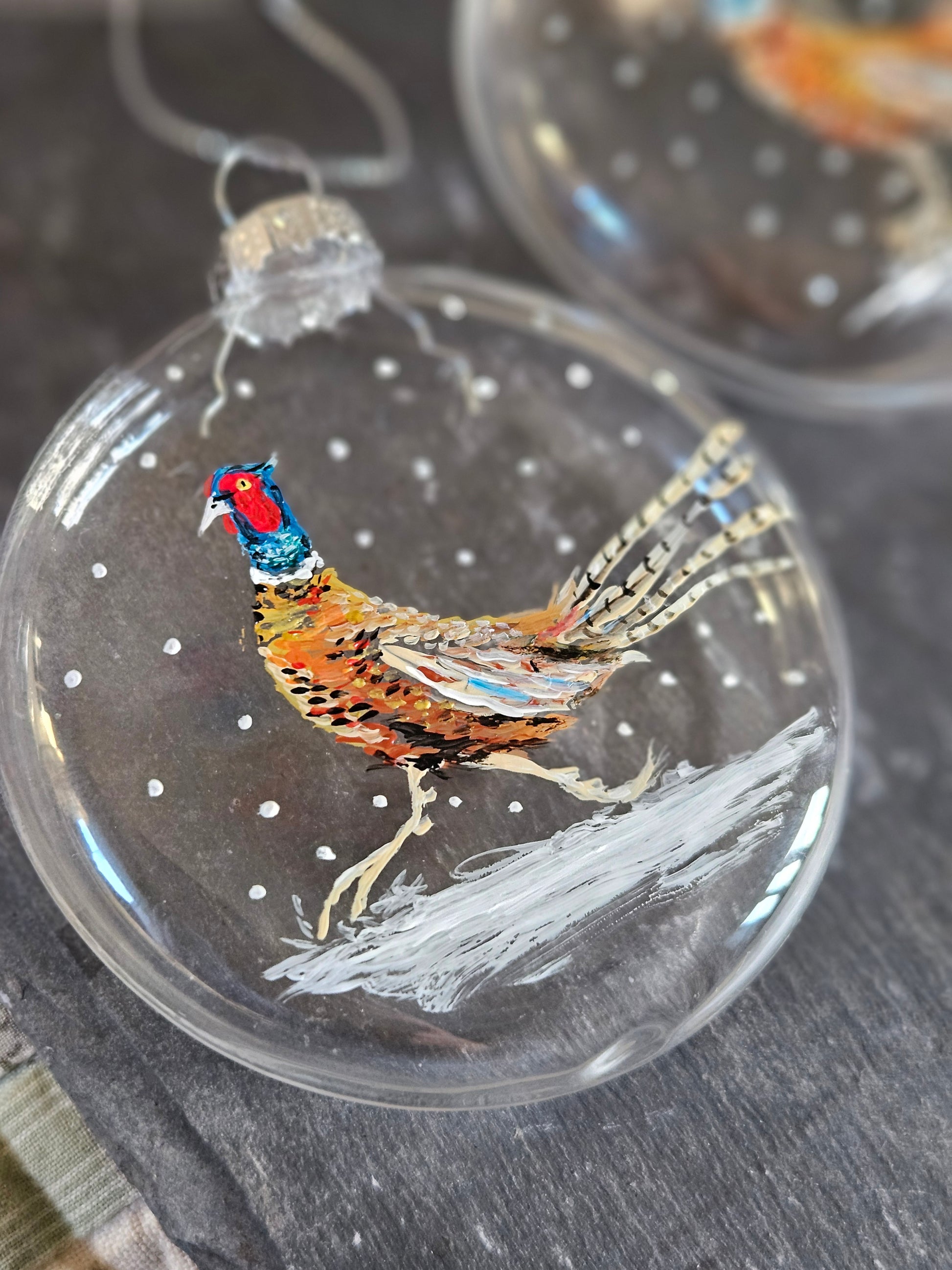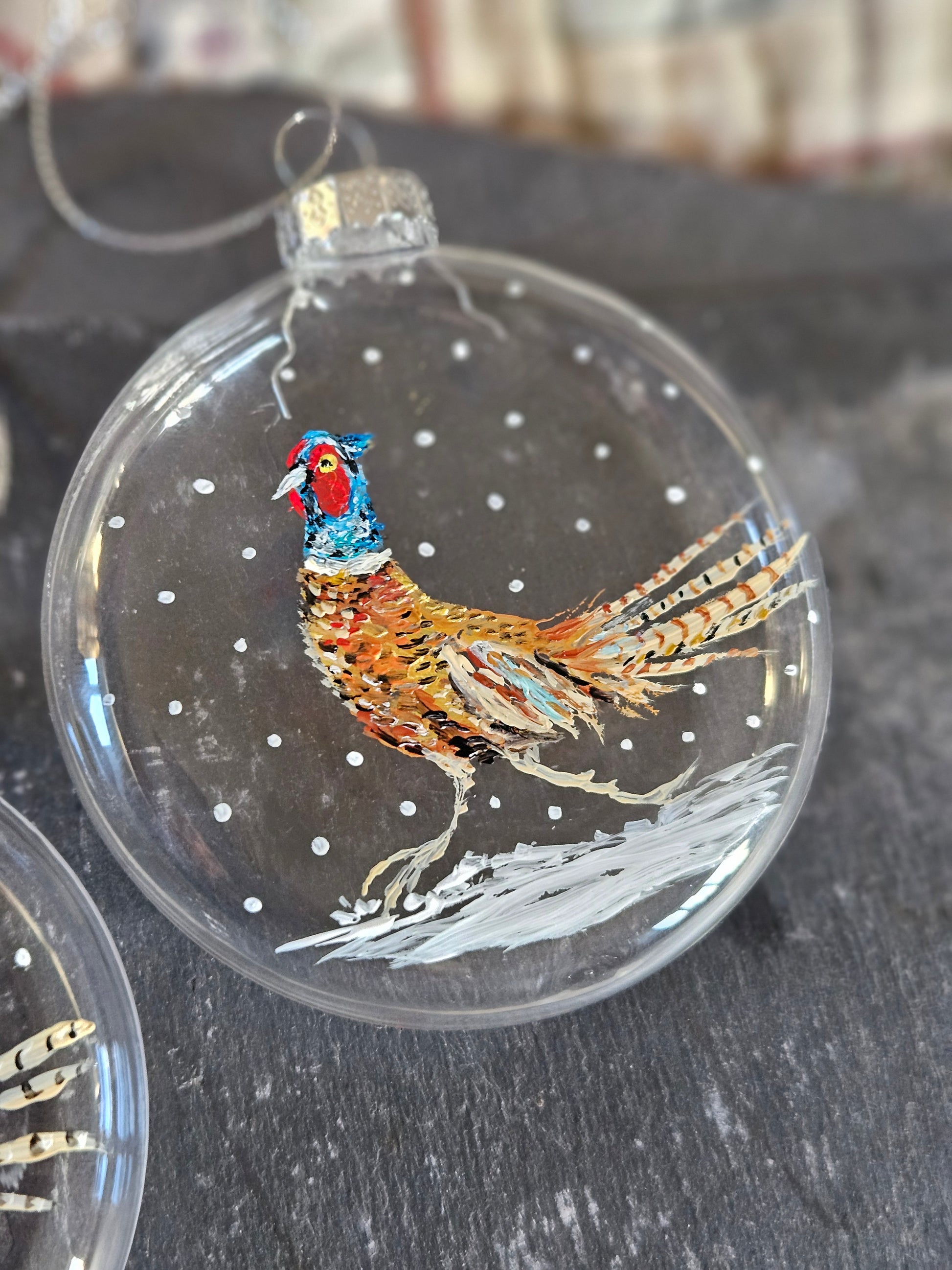 Hand Painted Pheasant in the snow glass round flat glass boxed bauble